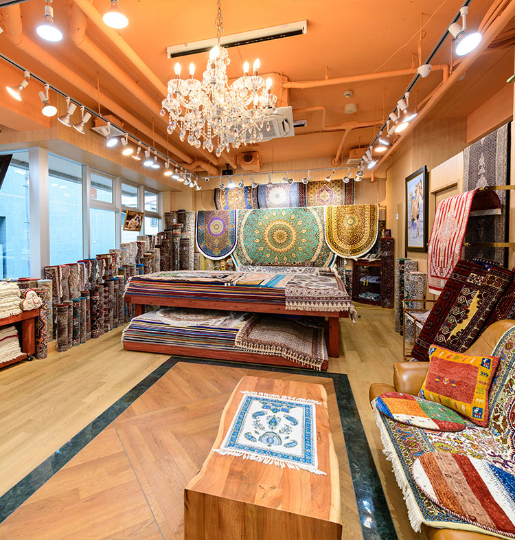 ガラス張りの解放感溢れるおしゃれな店内では、リーズナブルなトライバルラグ、タウンラグから最高級シルクやアンティークのシティラグまで幅広く取り揃えています。